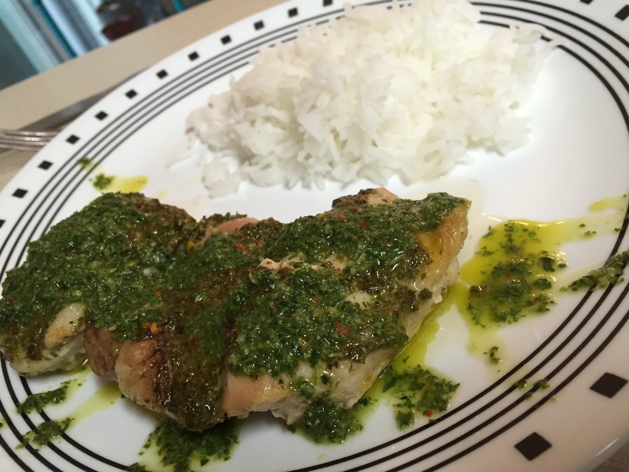 Before I reviewed this book, I wanted to test out a recipe. I chose Baked Chicken with Minted Chimichurri Sauce. The baked chicken part was pretty simple—some chicken thighs marinated in the minted chimichurri sauce featured in the book.